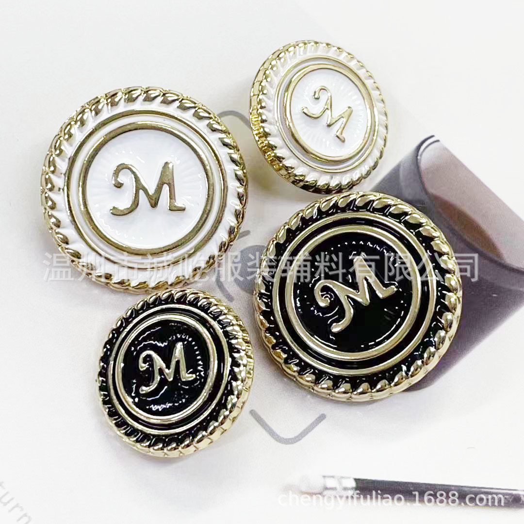 【Mアルファベットボタン】ラウンドメタルポイント白黒オイルボタン小香風セーターカーディガン前立て飾りボタン