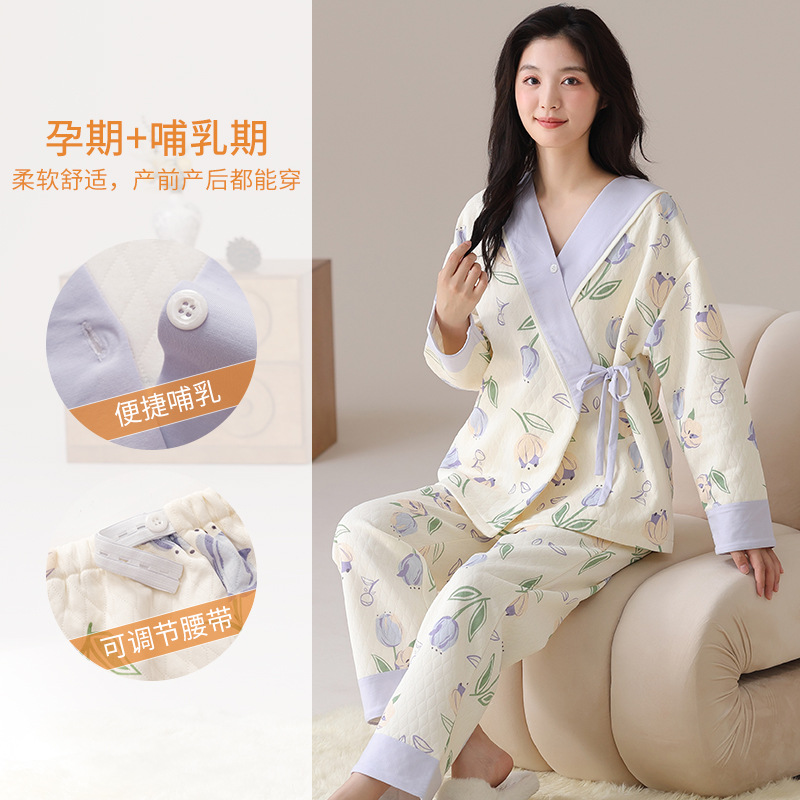 秋冬の新型は厚くて暖かい長袖の冬の妊婦の授乳する月子服の家庭服の空気の綿のサンドイッチのパジャマの女性を厚くします。
