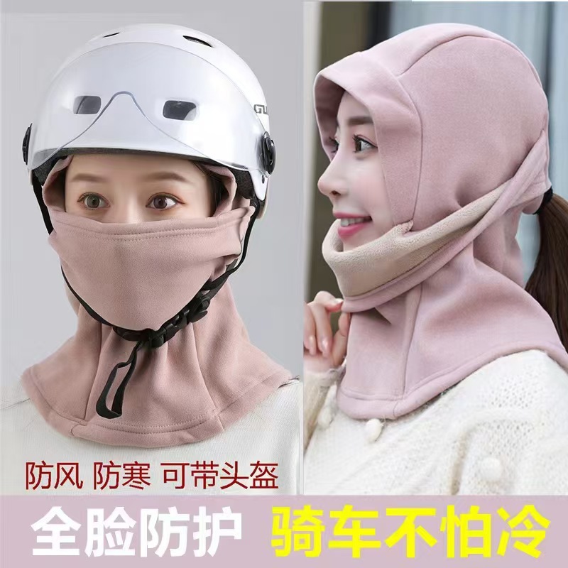 電気自動車の保温帽子は首を囲んで帽子をかぶっています。