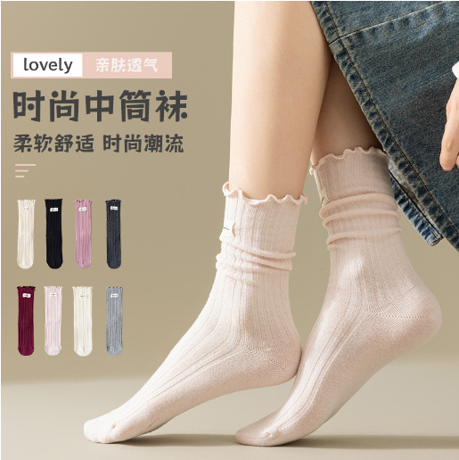 靴下の女性の中筒のカレー色の美ラードは靴下の純色の布のマークの木の耳元の日本のinsを積み上げて甘美な綿の靴下を配合します。