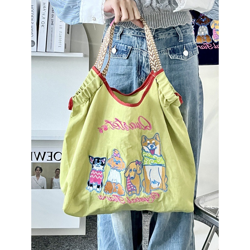日本の女性カバン漫画柴犬刺繍ハンドバッグ大容量バッグ学生斜めショルダーバッグ百合ナイロンキャンバスバッグ