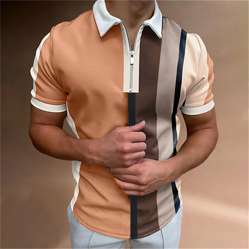 夏メンズ半袖ポロシャツ3Dデジタルプリントストライプポロシャツメンズジッパーポロシャツ上着