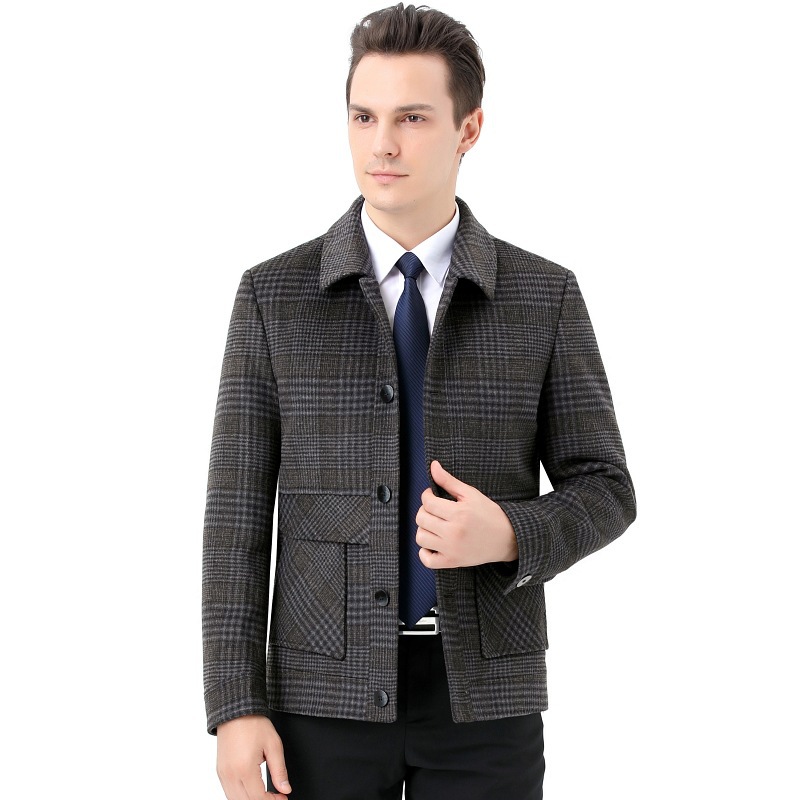 2023 秋の新中高年メンズジャケットビジネスカジュアルチェック柄ウールジャケットお父さんジャケット
