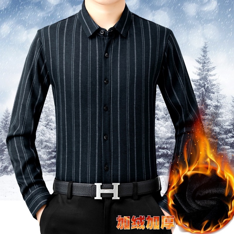 2024 冬のメンズ長袖サーマルシャツ中年カジュアルベルベット厚みのある非アイロンカシミアストライプシャツ男性用