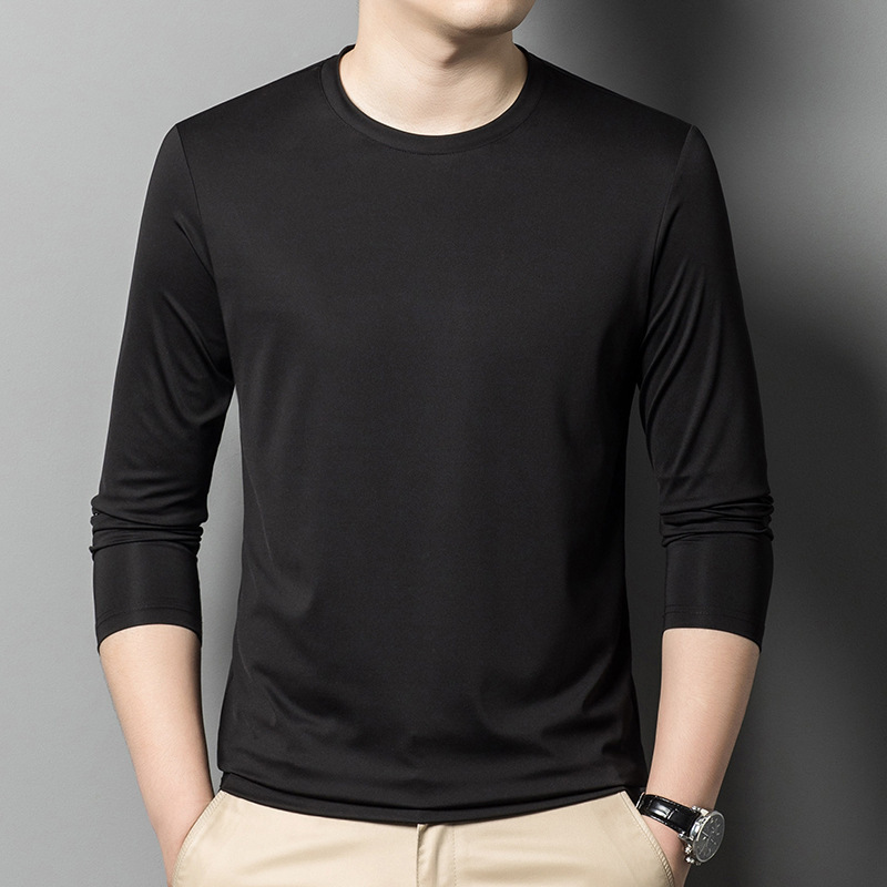 2023 秋の新メンズ長袖 Tシャツプルオーバーラウンドネック青中年ファッションカジュアルシルケットボトムシャツ男性用