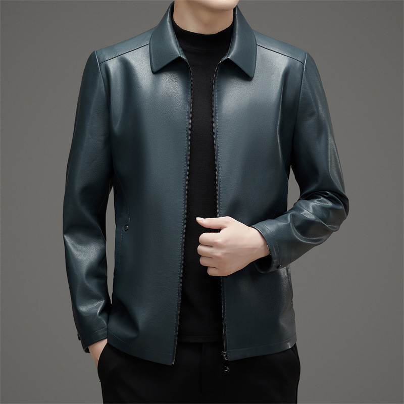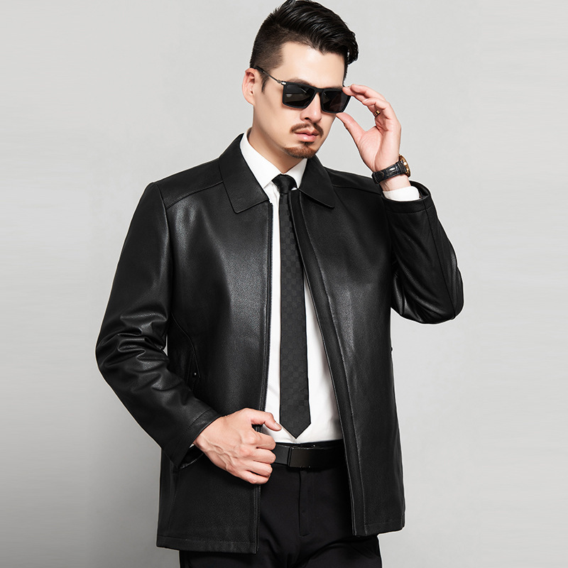 秋冬メンズレザージャケット中年男性ミドル丈ジッパーラペル第一層シープスキンレザージャケット