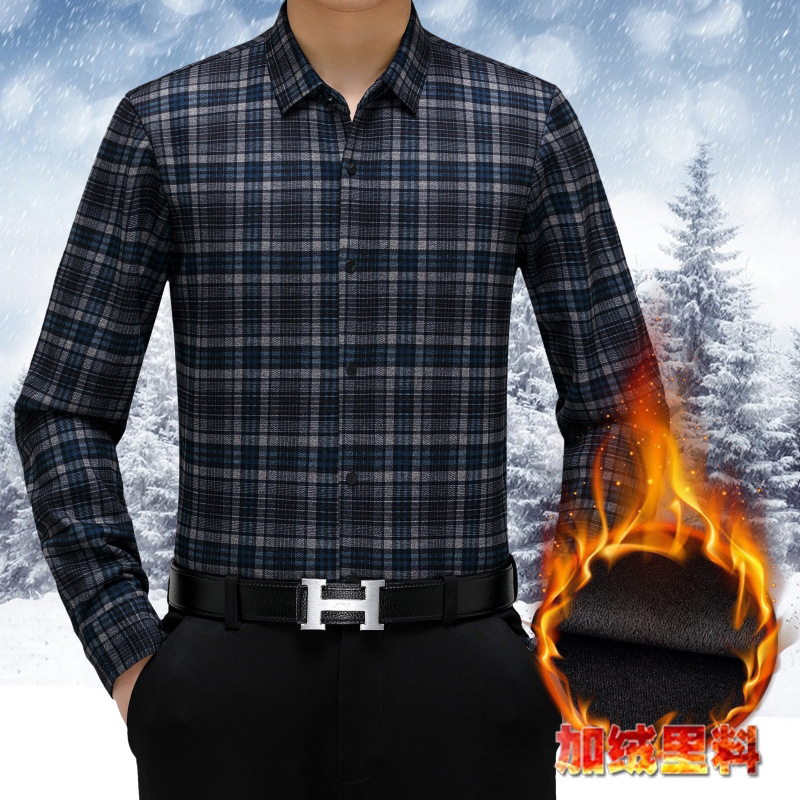 2024 メンズ厚みのあるベルベットシャツ冬長袖チェック柄大きいサイズ中年カジュアルカシミヤ暖かいシャツ男性用