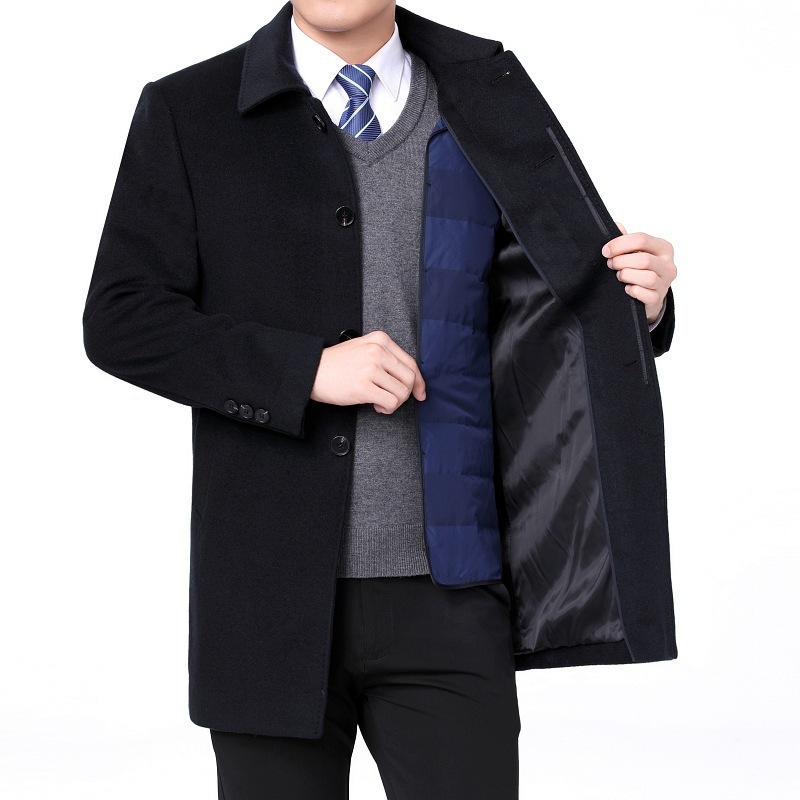 冬のメンズウールコート、中高年向けスーツカラー、ミドル丈の綿入りファッションカシミヤウインドブレーカー、厚手コート