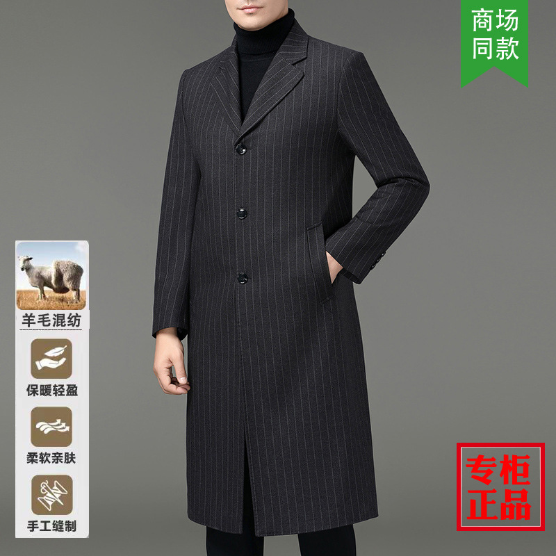 2025 春コート中年お父さんメンズロングスーツ襟ウールストライプコート