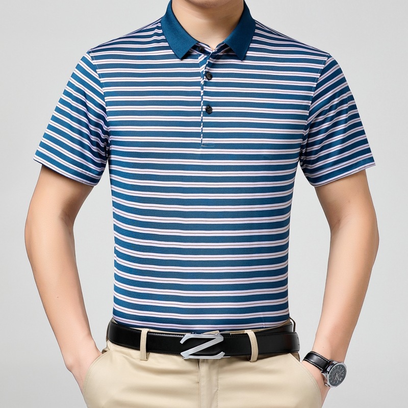 2025 新しい夏のメンズマルベリーシルク半袖 Tシャツカジュアルストライプラペル多用途クール半袖シャツ男性用