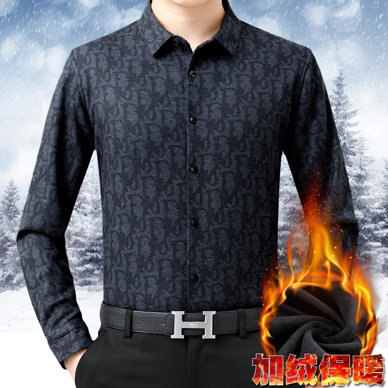 2024 冬のメンズ長袖サーマルシャツ中年カジュアルベルベット厚みのある非アイロンカシミアプリントシャツ男性用