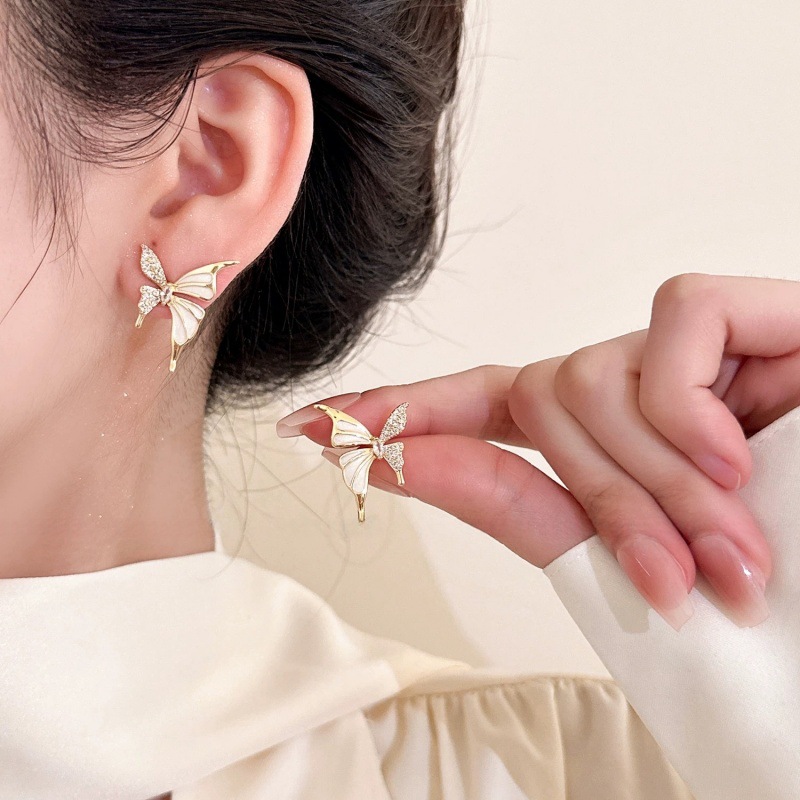 大衆が設計した金色のジルコン画油の白い蝶のピアスの女性の軽い豪華な気質の精巧なイヤリング2025新型の耳飾り