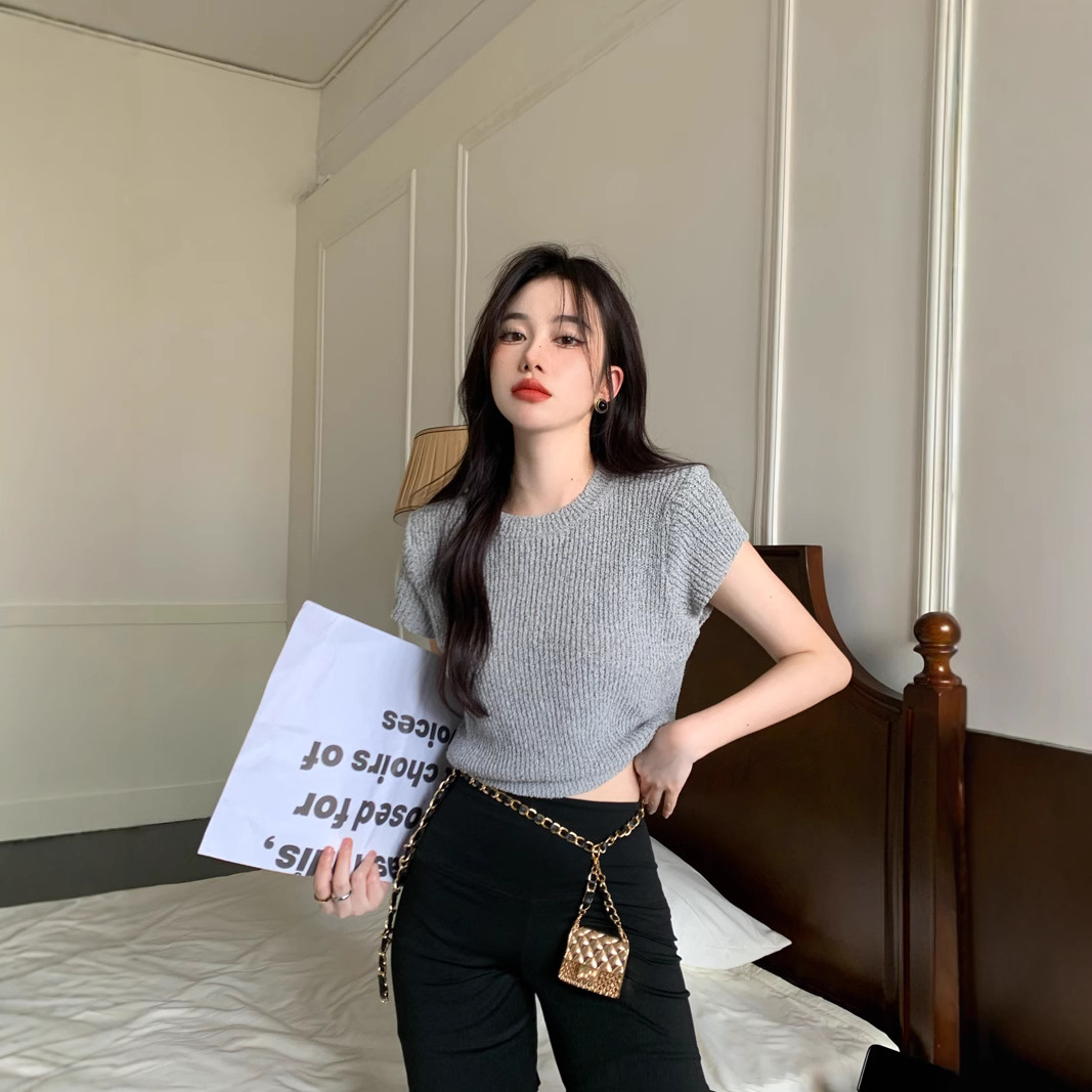 2953 # 港味レトログレー半袖ニット女性夏2025新デザイン感小大衆ショートコート