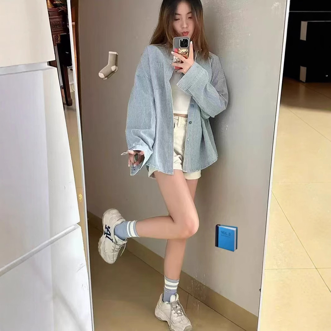 韓系小清新減齢衝突色縞シャツ男女春秋独特のユニークなカラーボタンカジュアルシャツ