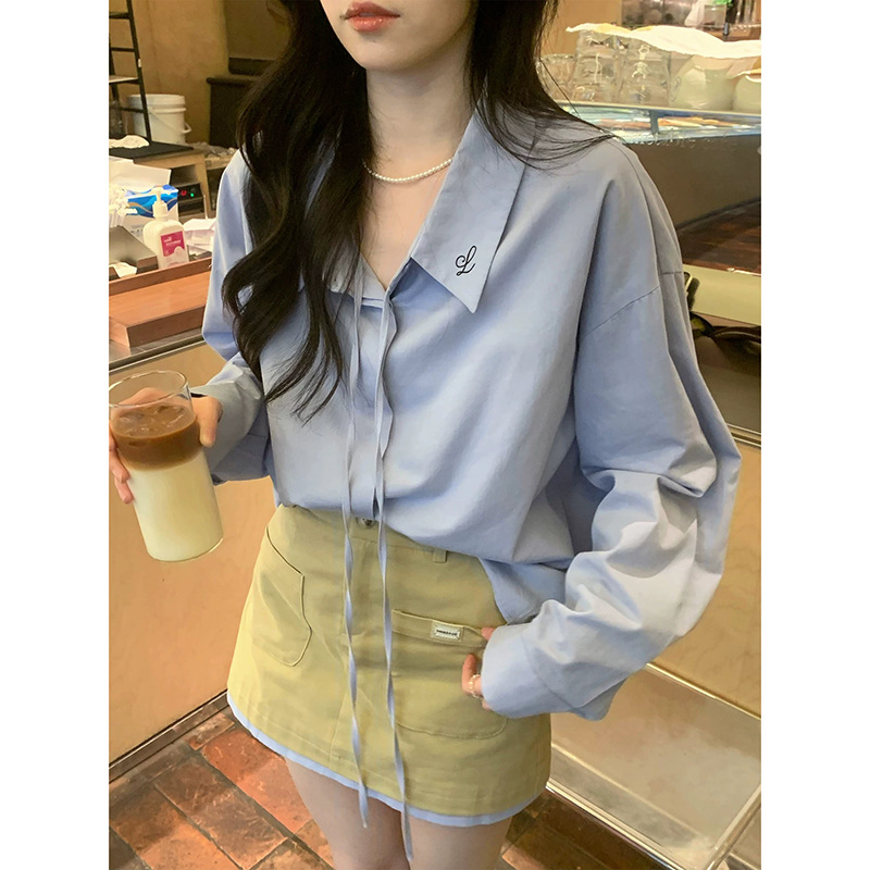 03015 #2025夏の新型ショートデザイン感ins上着シャツ偽2枚polo襟ニット女