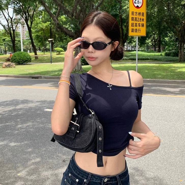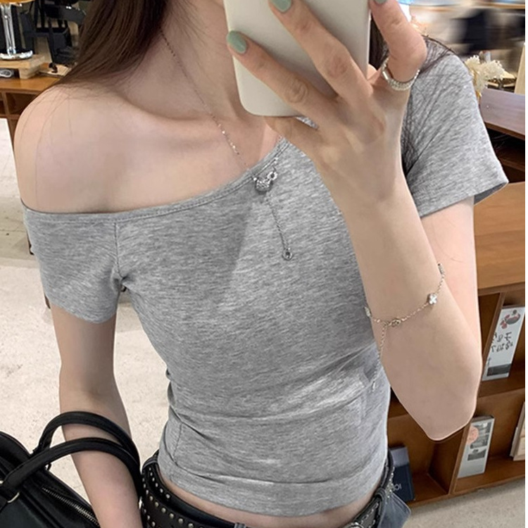 玖玖灰色純欲修身半袖tシャツ女性夏セクシーギャル斜め露肩韓系ショート上着ブーム