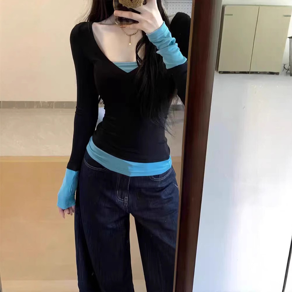 (広州の生地) アメリカのギャルの偽の2つの長袖は腰を収めて身を修めて色にぶつかって底のシャツをつなぎます。
