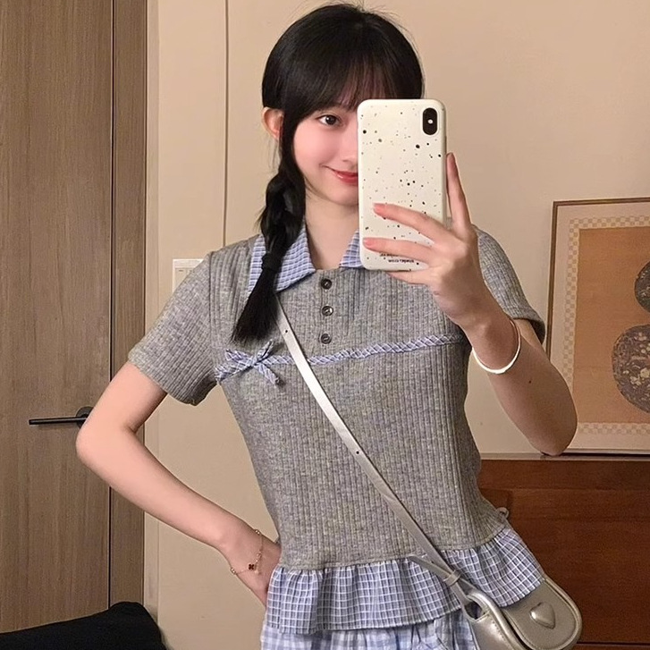 玖玖偽二枚POLO襟半袖tシャツ女性夏甜妹小柄蝶結びショートタイプ修身上着女性