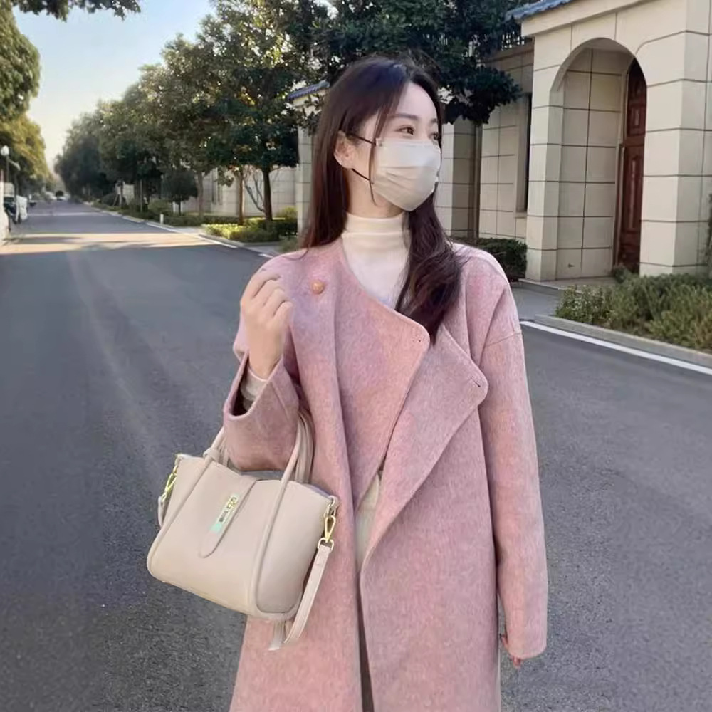 高級感のあるヘボン風のピンクの毛は女性の秋冬の新型の韓国版の小さい子がゆったりしていて、やせているラシャのコートが見えます。