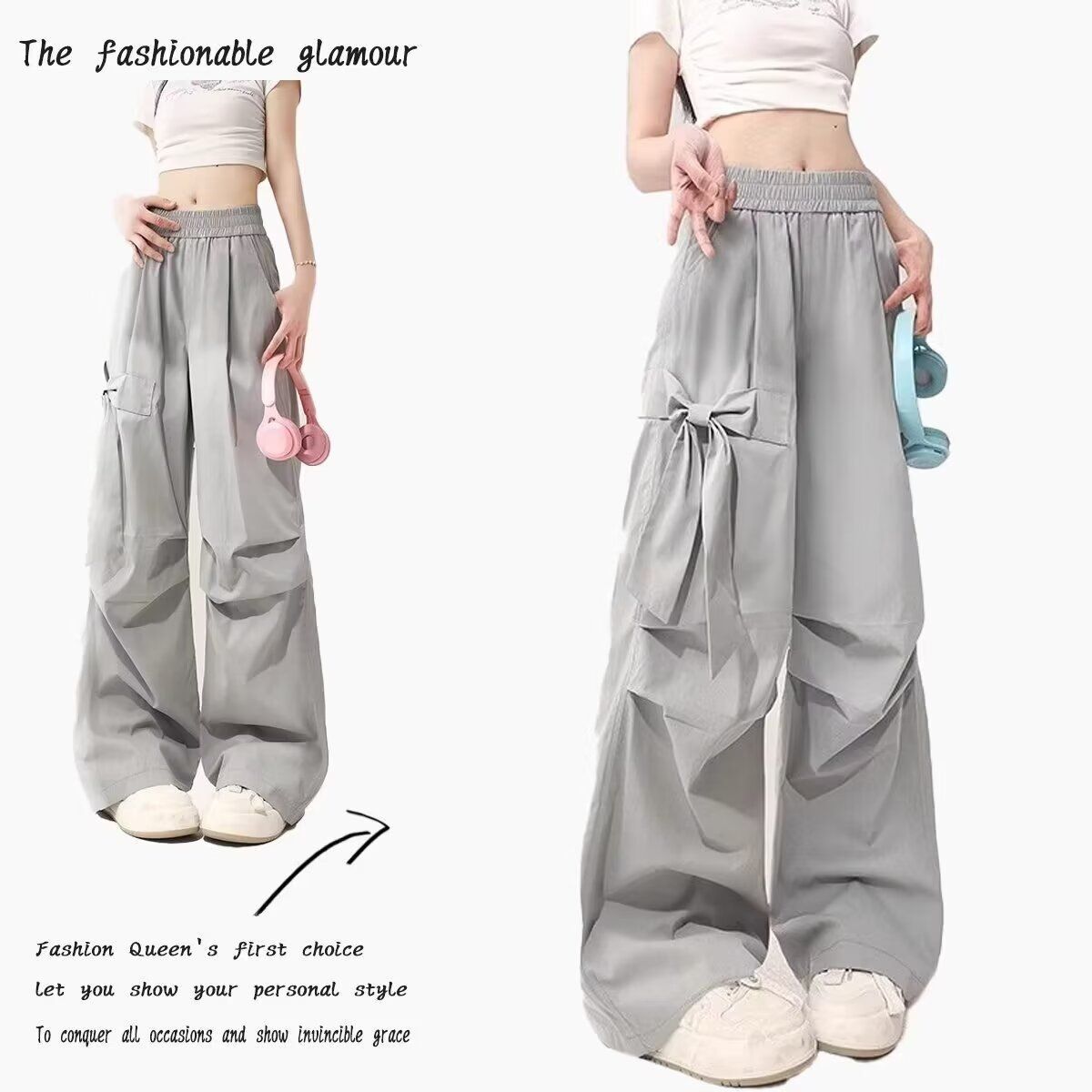 デザイン感のある蝶結びの速乾性のある灰色の工装カジュアルパンツの女性2024の新しいテンションの高いウエストのゆったりしたワイドパンツ