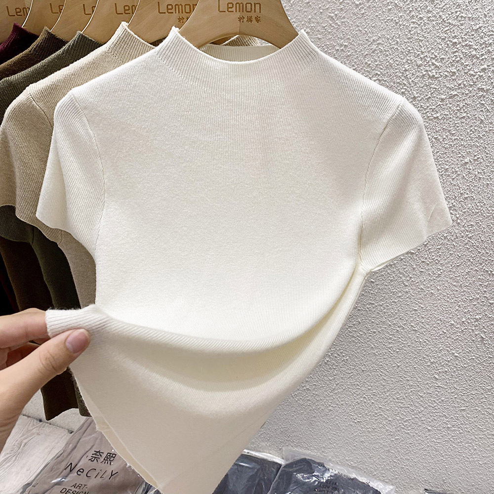 5892 # 半高襟ニット半袖シャツの女性デザイン感がある