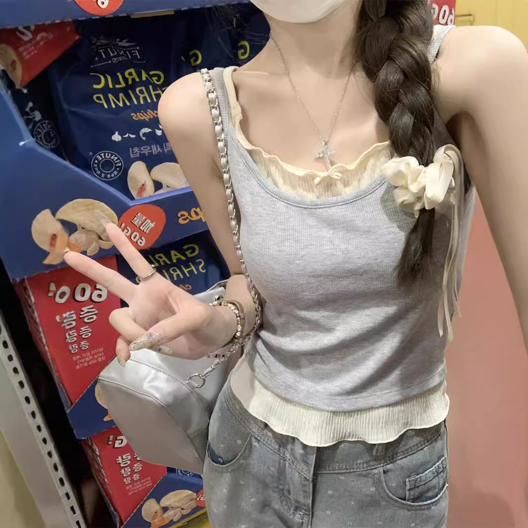 5898 # 幅の肩に氷糸の縞模様のキャミソールの女性の新製品の中に短い襟の袖のない薄い上着を着る