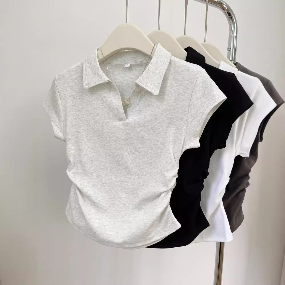 MR 40本綿1*1正肩tシャツ女性デザイン感不規則しわショートポロシャツ上着