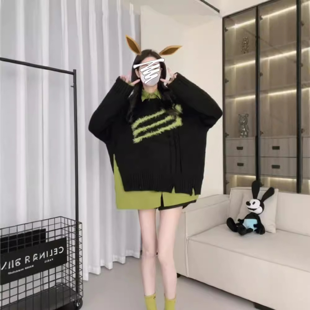 韓国版の怠惰な風の黒い丸首のセーターの女性の秋冬のデザイン感のニットの外は優しい雰囲気の上着を着ます。