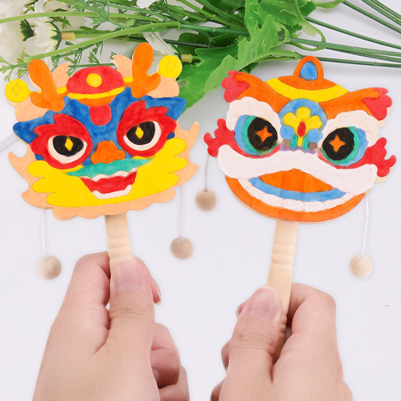 木製の手は小鼓の白地の子供のDIYの創意の美術の落書きの絵画の手作りのおもちゃの彩色の絵の波の太鼓を振ります。