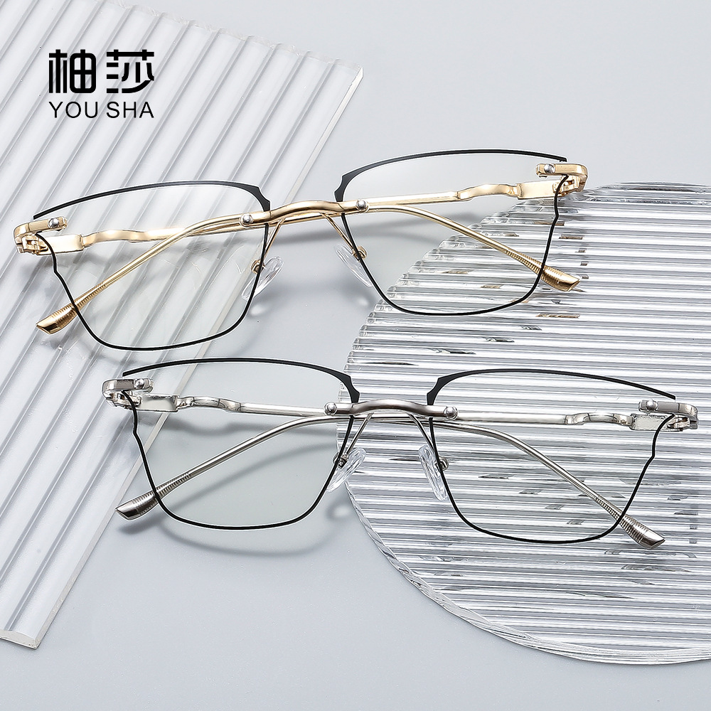 シンプルな高精細仕上げの男性用フラワーメガネ、ゴールドワイヤー、ブルーライト防止、フレームレス、超軽量老眼鏡