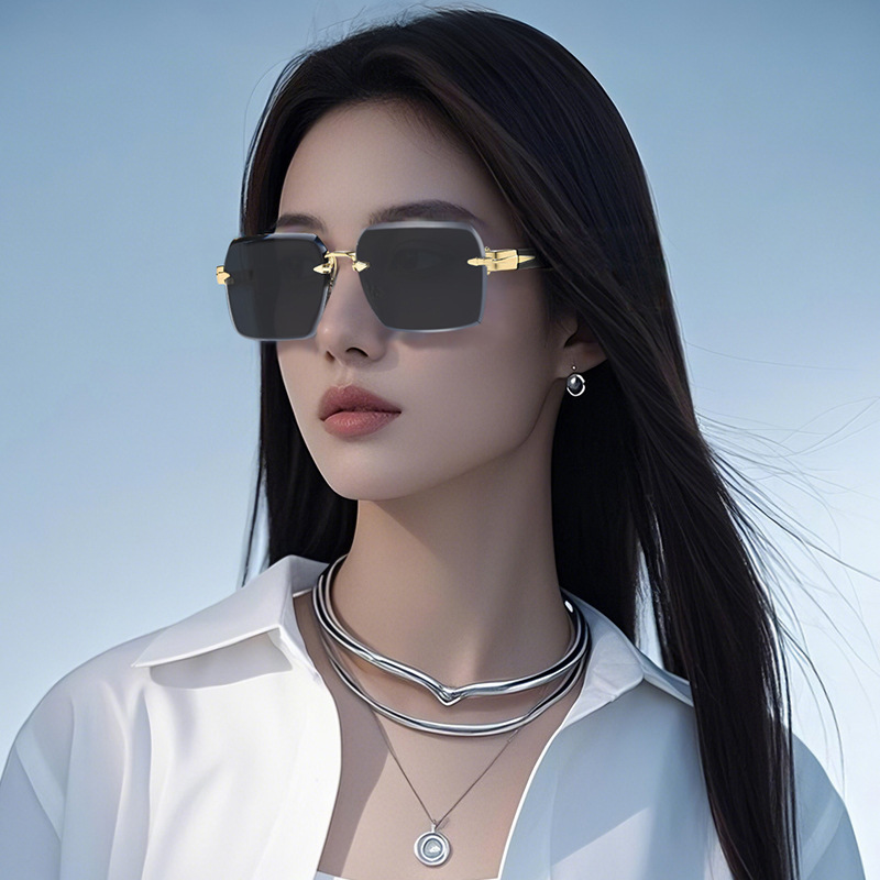 新しいフレームレスエッジカットサングラス、ハイエンドのインターネットセレブ抗UVクロスボーダーグラデーションサングラス、女性用日焼け止め