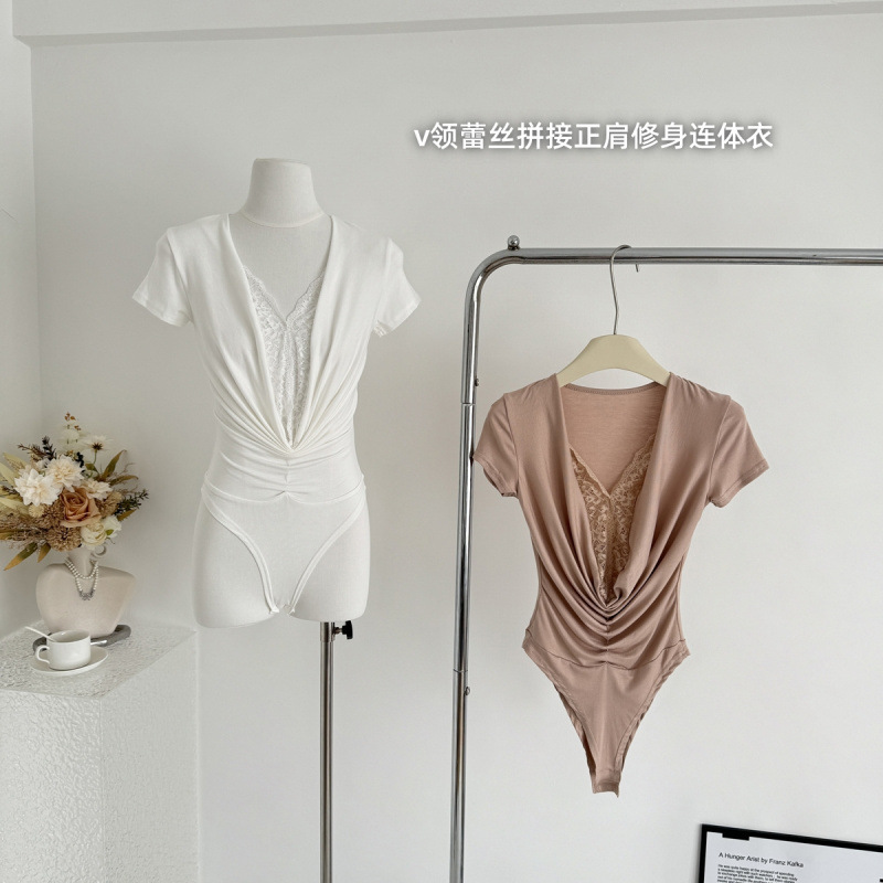 リアルショットとリアルプライスホワイトレースVネック半袖Tシャツ夏のホットガールスリムフィットワンピーストップ女性用