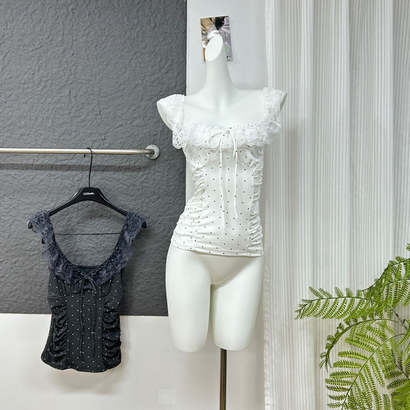 レースの小さなフリル袖、プリーツ入り水玉模様のキャミソール、女性用スリムフィットショートトップス
