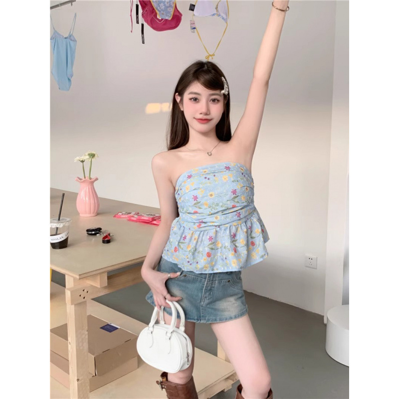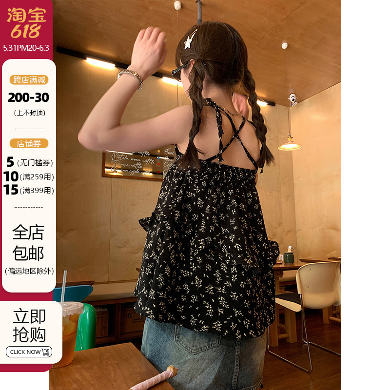 実拍 ~ 甘いギャルの花のキャミソール女性の夏のレトロなvネックのスリムなセクシーなショートタイプの上着の外着