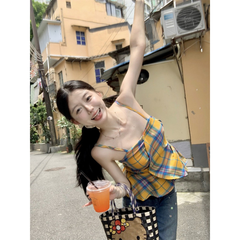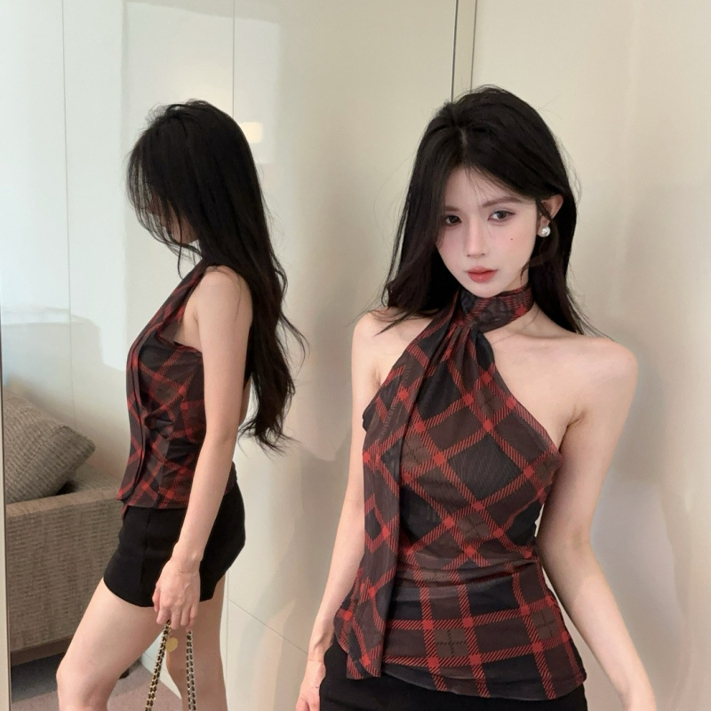 実拍の赤い格子縞のリボンは首のガーターのベストの女性の夏のギャルの外で上着を着ます。