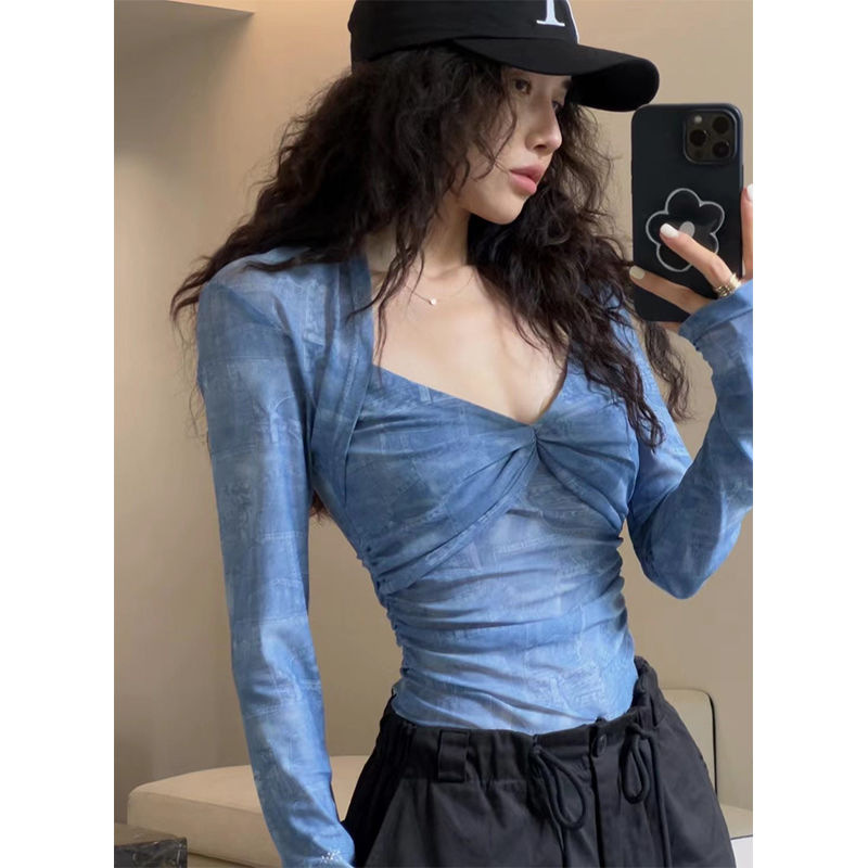 純粋な欲風vネックレースtシャツ女性2024秋冬の新しい気質が痩せている中に長袖の上着を着ている
