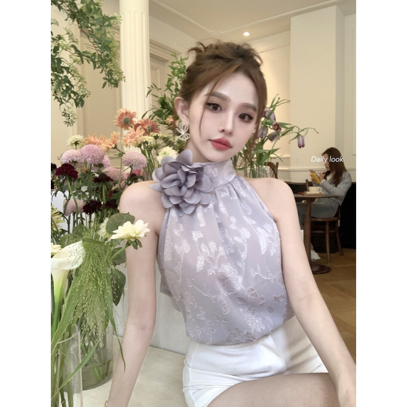 実写 ~ デザイン感のある青い首の花のストラップの小さいベストの女性の外は甘い辛いハスの葉の辺の短いタイプを着て肩を現します。