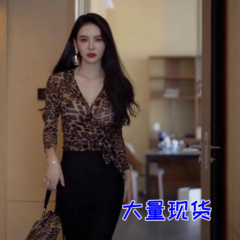 Vネックのヒョウ柄の長袖のT袖の女性の夏の軽くて熟している風の女性の雰囲気の小さい透のストラップは腰のセクシーなネットの上着を収めます。