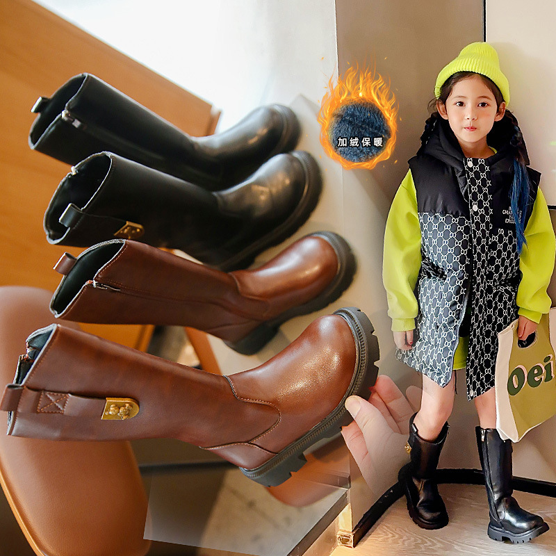 女の子の綿入りブーツは暖かい2024秋冬新作サイドジッパー子供用英国風厚底レザー防水トレンド