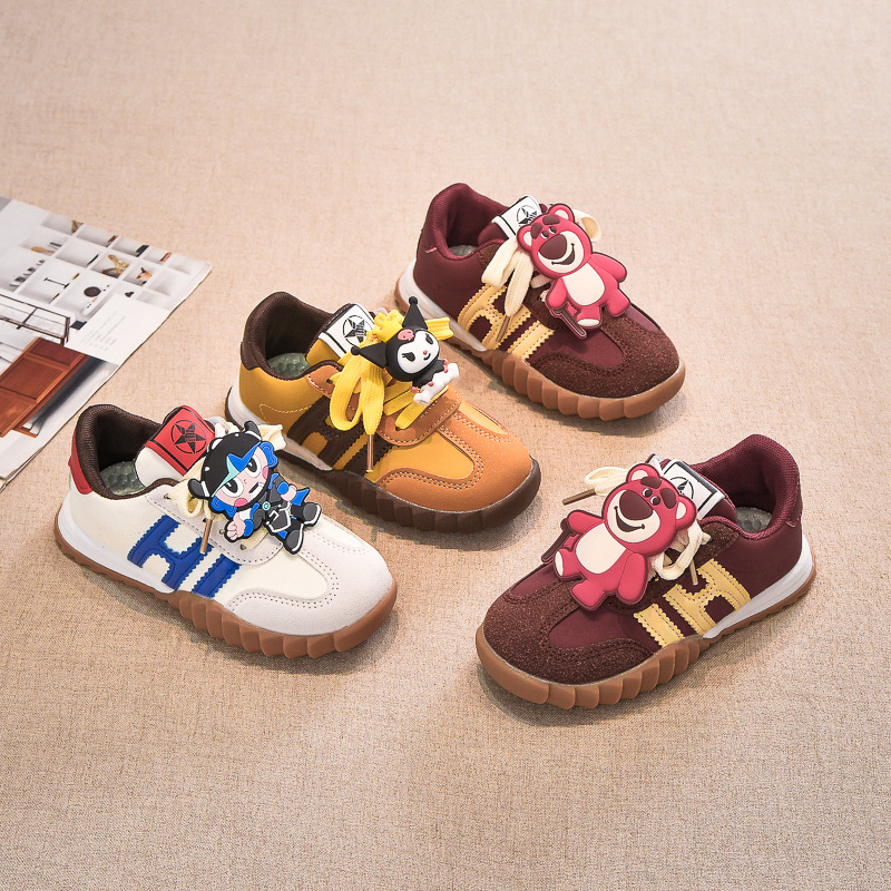 子供の厚い底のイチゴの熊の運動靴の皮面の2024年秋冬の新型の滑り止めの中で大きい子供の男の子のランニングシューズのファッション
