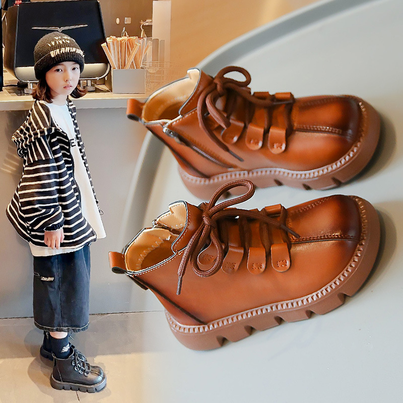 子供の革の面のショートブーツの2024年の春と秋の新型の中で大きい子供の女の子のマーティンの靴の前のひもの百合の潮の子供の滑り止め