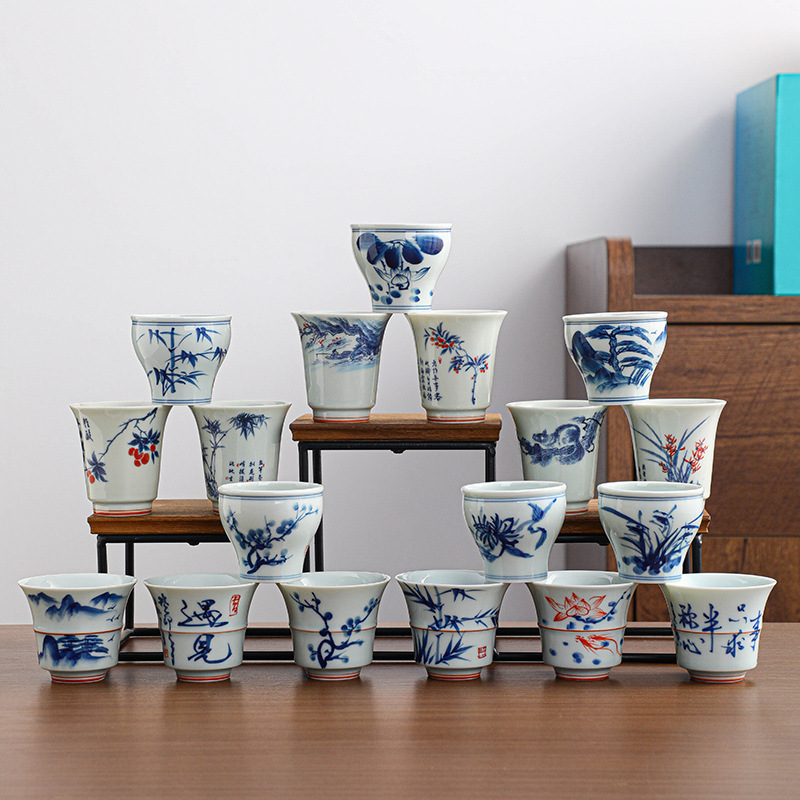 手描きの青と白の磁器ティーカップ、シングルカップ、カンフーティーカップ、シングルセラミックティーカップ、小さなティーボウル、マスターカップティーセット