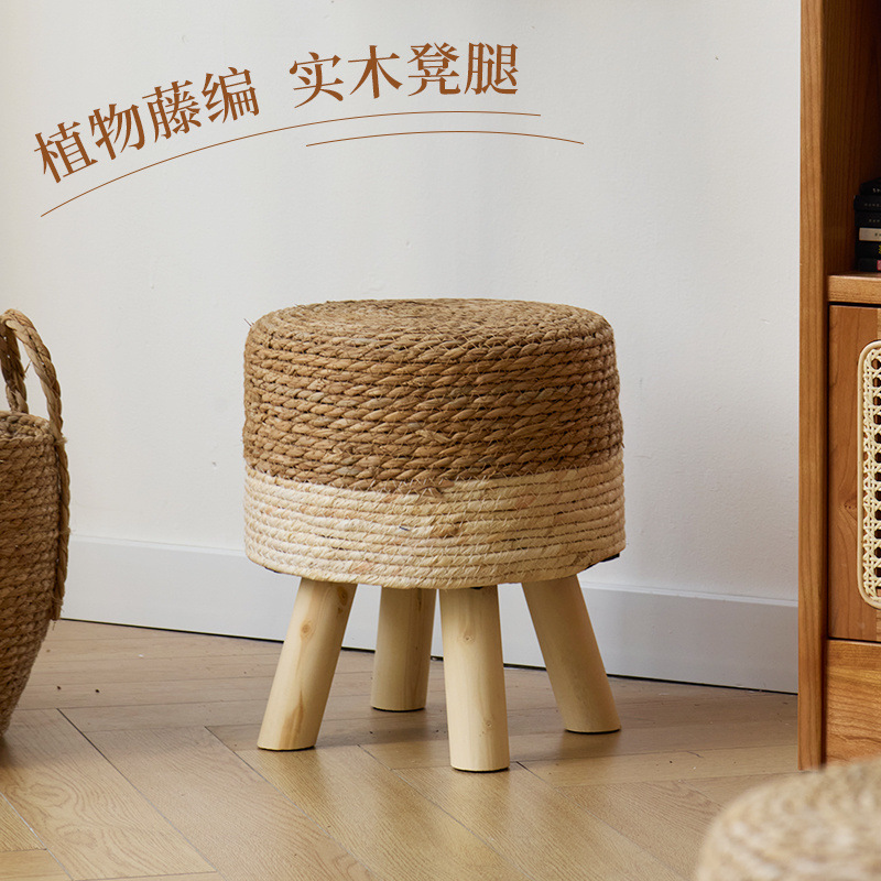 籐編みラウンドスツール無垢材リビングルーム低脚小さなベンチ牧歌的な籐編みスツールソファスツール子供用クリエイティブスツール