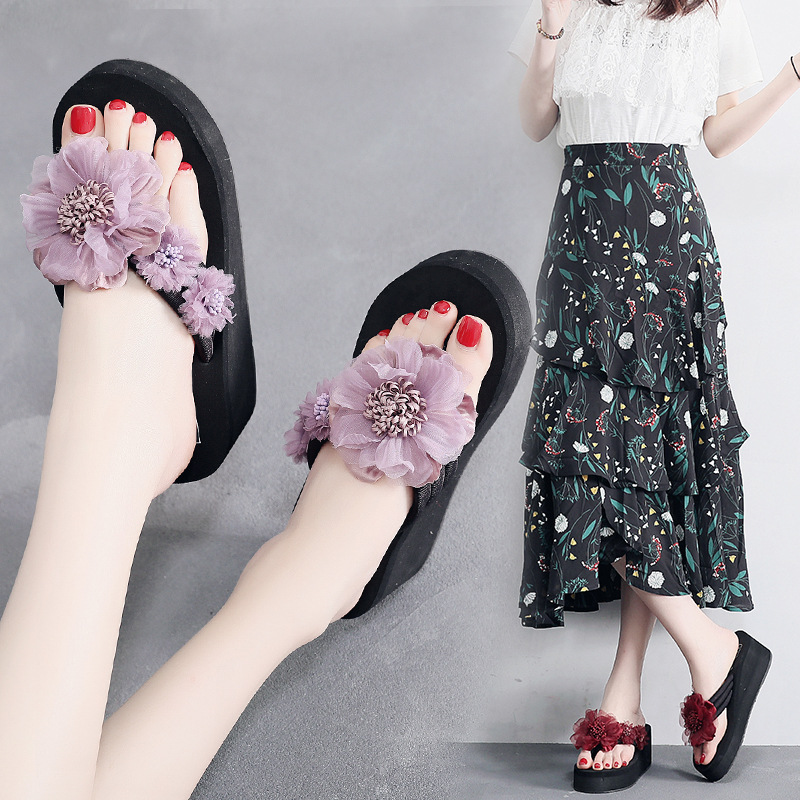 2023夏の新しい純色の花の人の字のスリッパの女性の外は坂と厚い底のファッションのカジュアルな砂浜のサンダルを着ます。
