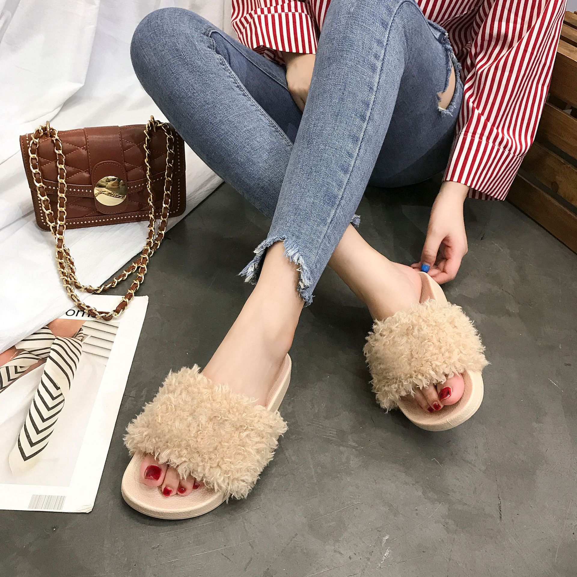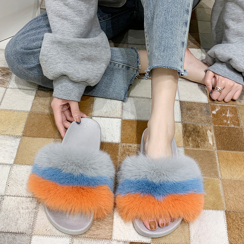 2023韓国版の毛のスリッパの女性は秋冬のファッションのカジュアルな保温の平の家の室内のぬいぐるみのスリッパを着ます。
