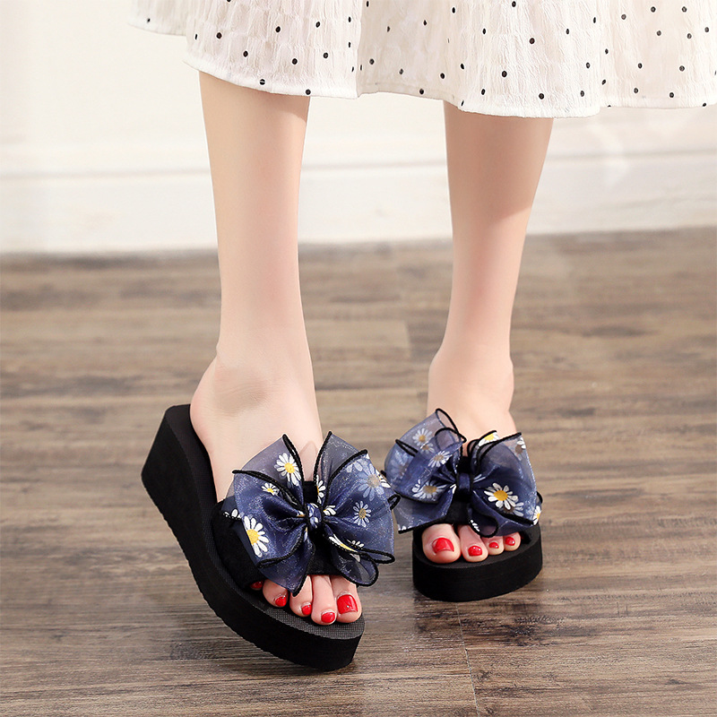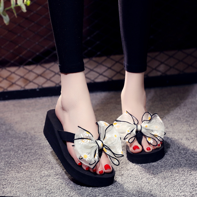スリッパの卸売り夏の新型のデイジーの蝶結びの人の字のスリッパの女性の外はファッションの厚い底のスリッパを着て足を挟みます。