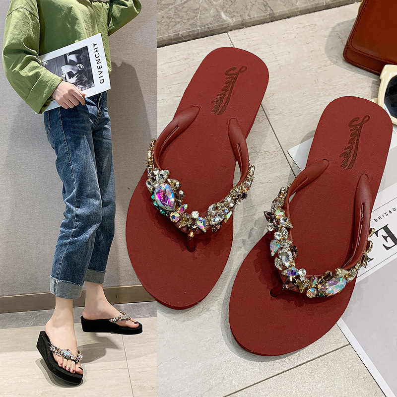 メーカー直販夏の新型真珠皇冠ドリル女性の人字スリッパ卸売りのフラットサンダル女性の外着