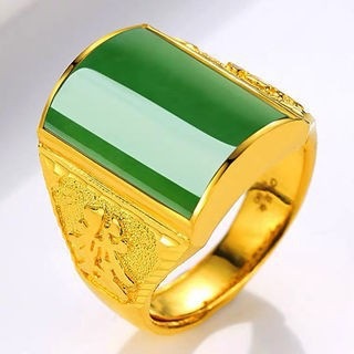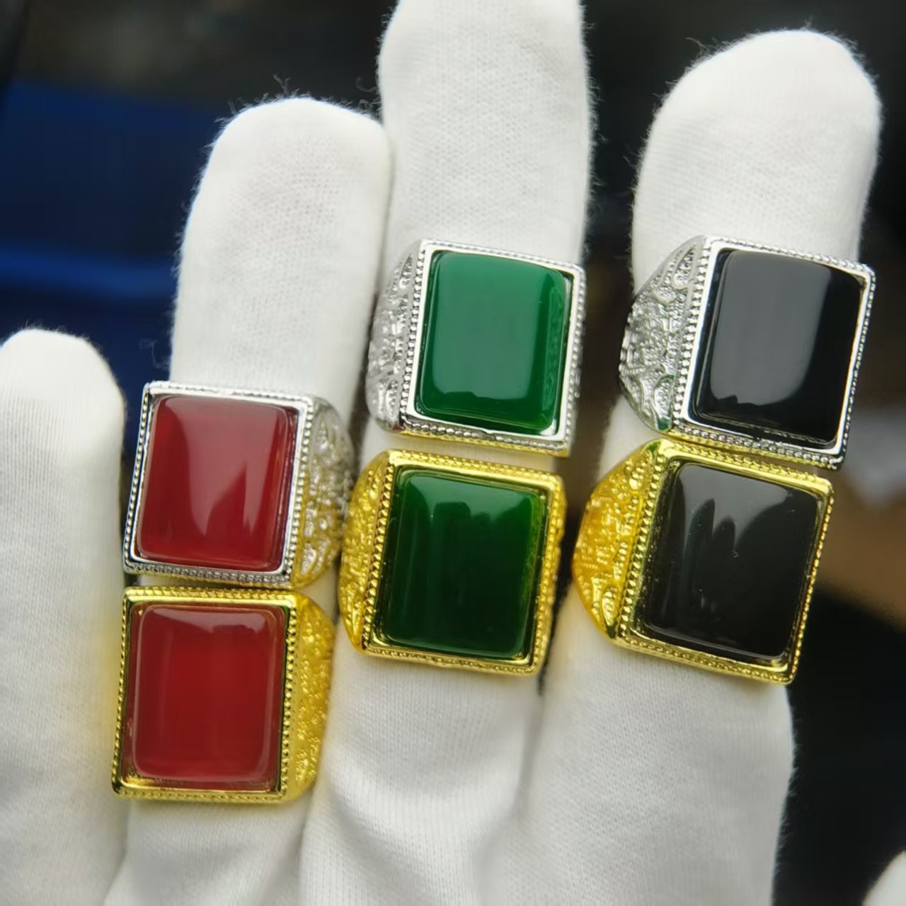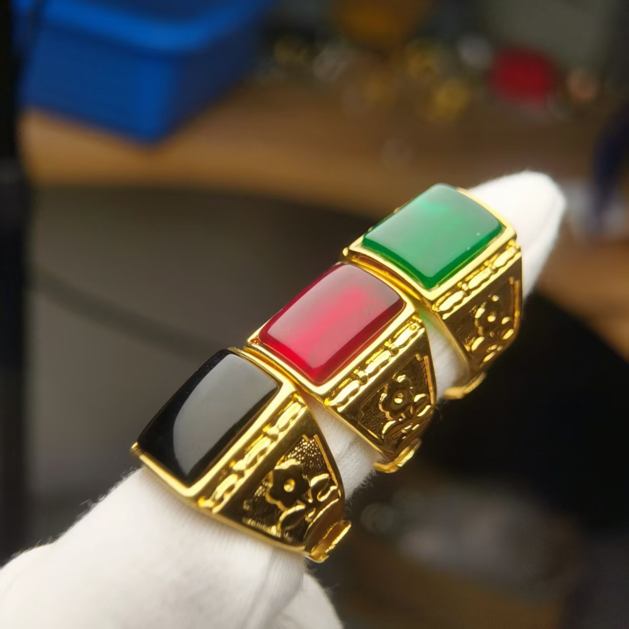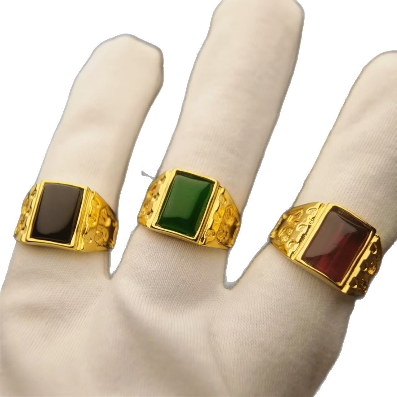 真鍮ゴールドメッキメンズリングゴールドメッキ寛大な赤緑黒翡翠リング瑪瑙象嵌ゴールドメッキジュエリー卸売