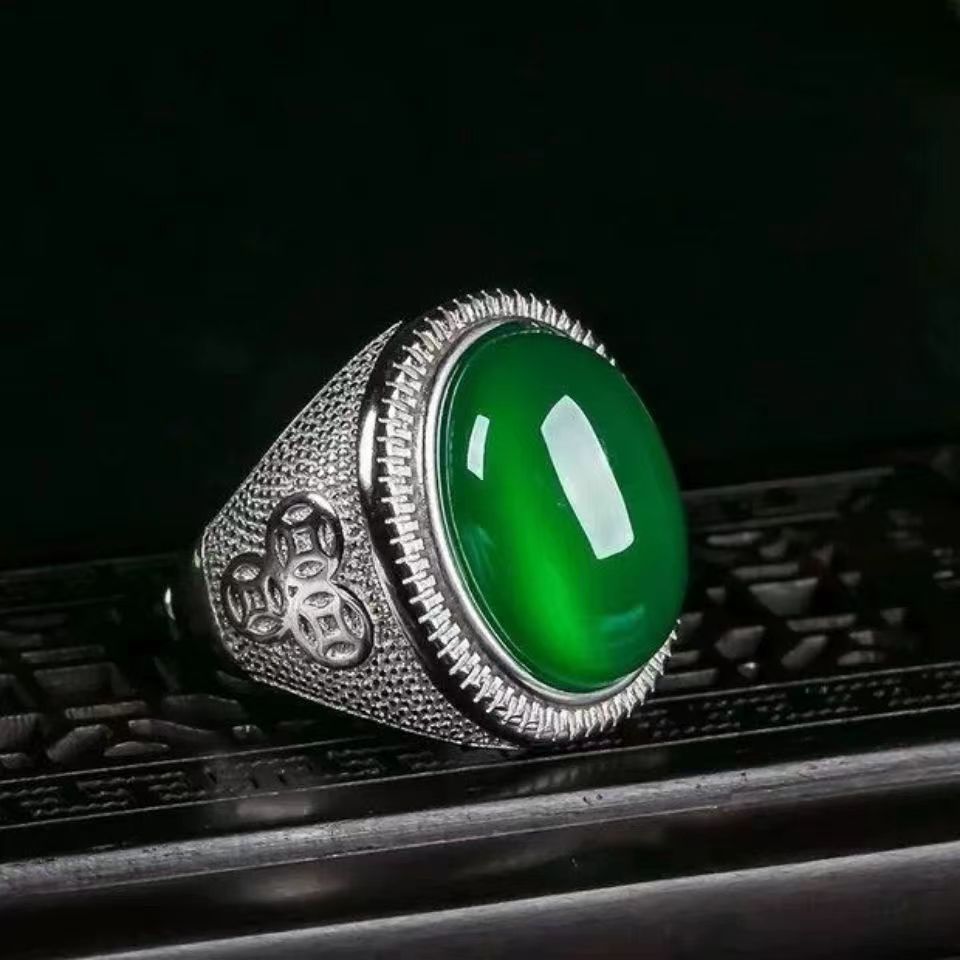 真似玉髄男金戒緑宝石男指輪銀メッキ瑪瑙指輪活口氷種祖母緑合金指輪