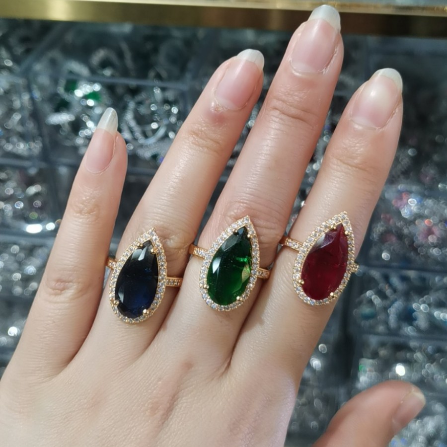 インターネット有名人のライブエメラルドジルコンオープンリング独立したステーション新しいウォータードロップパーソナライズリングライト高級ルビージュエリー